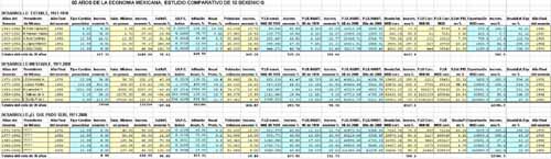Habitante Por el contrario de lo que usualmente se imagina, esta variable económica no representa el promedio de lo que realmente percibe cada habitante de un país, pues se obtiene de dividir la producción total entre el número de habitantes, pero sin embargo si es muy importante como punto de comparación. Entre mas alto sea el PIB por habitante de un país indicará mejor situación económica (riqueza) de sus habitantes, por el contrario si es muy bajo representará mala situación (pobreza) de sus habitantes. Sin embargo la mejor comparación se da al analizar las cifras de crecimiento del PIB por habitante en nuestro mismo país, de un sexenio con el siguiente o el anterior, pues nos dará un punto de referencia para saber si la situación económica de nuestro pueblo mejora o empeora en el período de comparación y de allí la importancia de este cálculo. Como el PIB que utilizamos es a precios constantes de 1970, la comparación es válida y al dividirlo entre el número de habitantes del año correspondiente obtenemos en este caso, PIB por habitante en Nuevos Pesos de 1970. Esto desde luego en el año 2000, treinta años después, no nos dice mayor cosa y por lo mismo debemos actualizar el valor obtenido a fin de convertir pesos de 1970 a pesos de 2000 y para ello utilizamos el único mecanismo que tenemos a mano que son los INPC promedio de los años de 1970 y del 2000. Una vez actualizado a pesos corrientes resulta fácil convertirlo a dólares corrientes aplicando también la tasa de cambio obtenida para finales del 2000. En el ámbito internacional se utiliza mucho para fines comparativos el PIB por habitante en dólares y por tal motivo se calcula así en la última columna de esta sección de la tabla. Pasando a analizar ahora los valores obtenidos tenemos lo siguiente, en lo que se refiere al PIB, en el período estable de 1941-1970 creció de manera global un 535.21% en el período, es de decir se multiplicó 5.35 veces. En el período inestable aunque creció mucho en los dos sexenios populistas, LEA y JLP, tuvo una terrible caída (fue negativo) en el sexenio de MMH, por lo cuál el resultado final en el período 1971-2000, apenas llegará a crecer un 205.88%, es decir mucho menos de la mitad que en el ciclo de crecimiento estable. En la sección de la tabla de